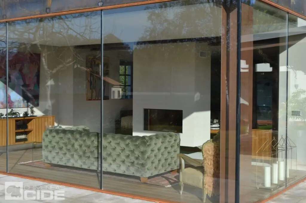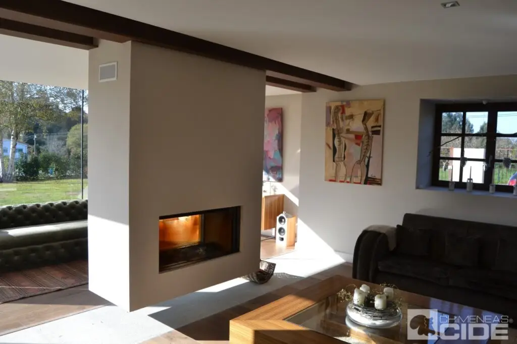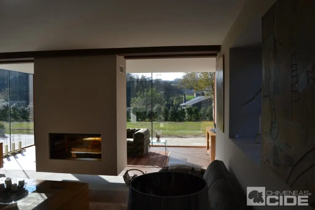 Al propietario no le gustaban las chimeneas centrales exentas, así que teníamos que idear la mejor manera de instalar una chimenea de obra. Finalmente decidimos que la mejor opción sería instalar un hogar grande, panorámico, que permitiese una gran visibilidad del fuego y de doble cara, que nos permitiese crear dos ambientes dentro de la estancia; así que elegimos el modelo Heat Pure 105 de Kal Fire.